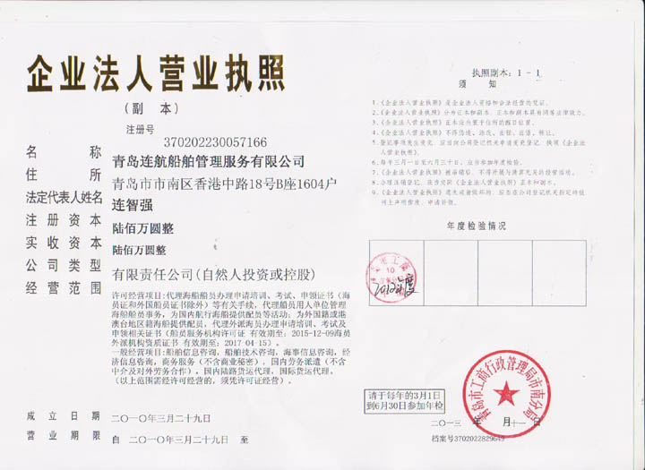 2012年04月青島連航船舶管理服務(wù)有限公司取得《海員外派機(jī)構(gòu)資質(zhì)證書(shū)》,為海洋船舶提供配員,代理船員用人單位管理海洋船舶船員事物,代理海洋船舶船員申請(qǐng)培訓(xùn)、考試、申請(qǐng)證書(shū)等業(yè)務(wù)。